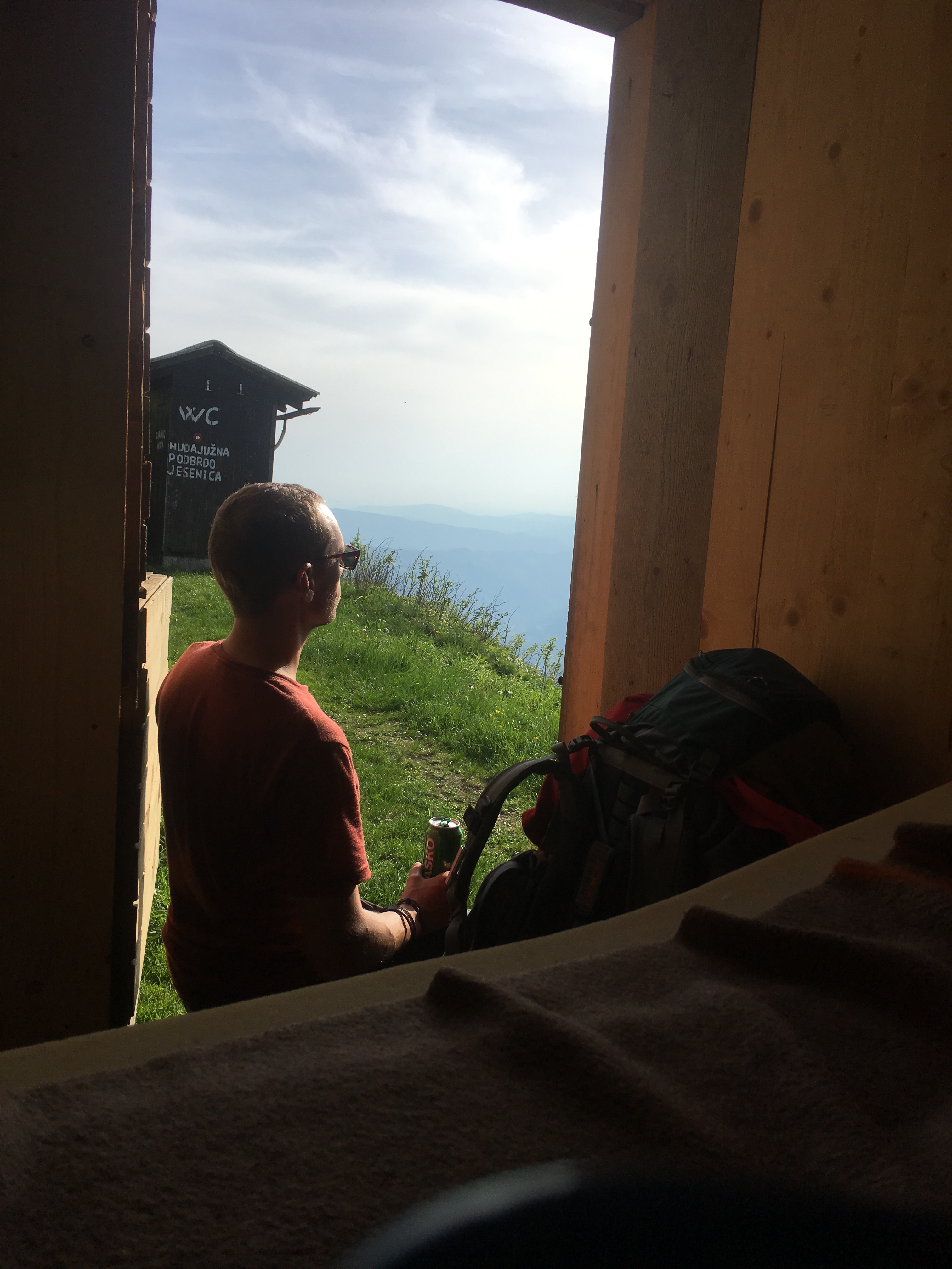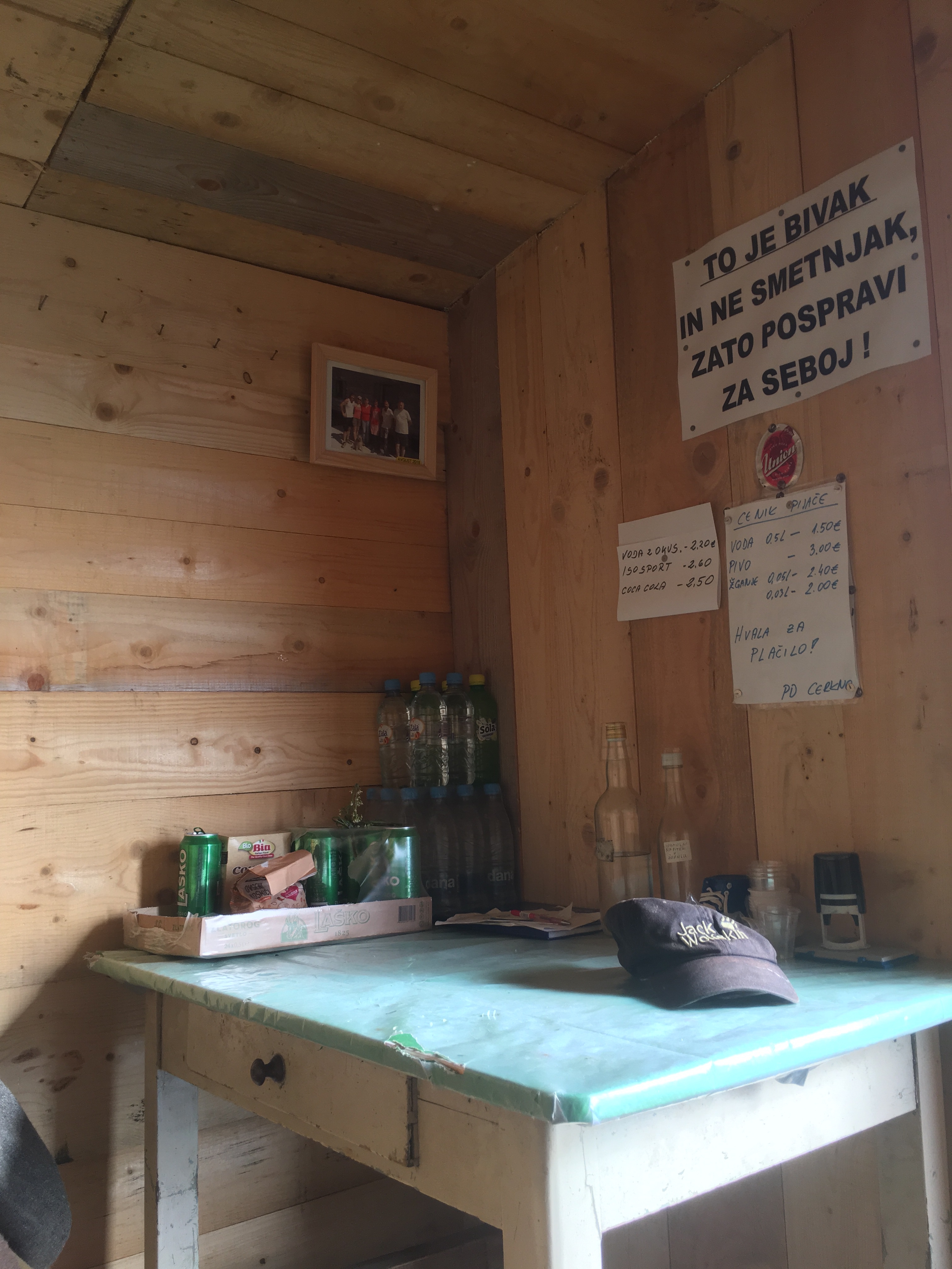 Und das Beste: die Getränke sind gekühlt, müssen also erst vor Kurzem für arme Wanderer wie mich dort platziert worden sein. Mit der Stimmung geht es schlagartig wieder nach oben und ich gönne mir erstmal ein kühles Bier. Natürlich mit Blick auf die Berge. Ganz im Hintergrund taucht schon der Triglav-Gipfel auf, der höchste Berg Sloweniens.