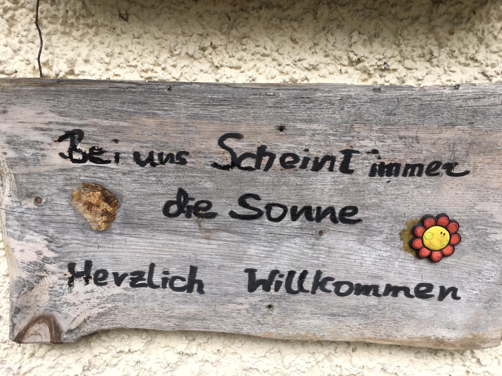 Neben der Haustür entdecke ich eine Holztafel mit der Aufschrift: „Bei uns scheint immer die Sonne. Herzlich Willkommen“.