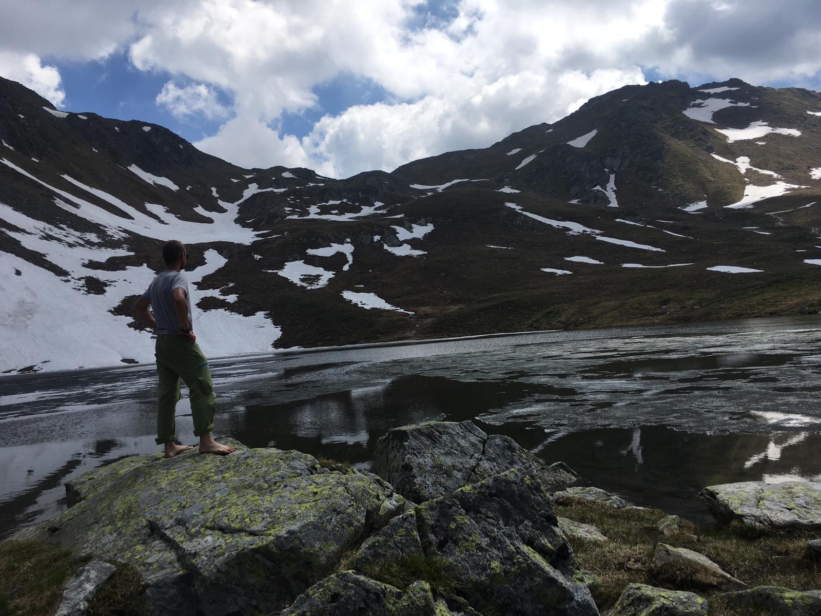 Die Sonne scheint unerbittlich und mich reizt es, in den See zu springen. Es sieht schon mächtig kalt aus und auf der Oberfläche schwimmen noch vereinzelt Eisschollen. Die Verlockung ist jedoch zu groß und ich taste mich langsam in den See vor. Ich schwimme eine kleine Runde und merke, wie die Kälte meinen Körper durchströmt – ein schönes Gefühl! Spätestens jetzt merke ich, dass ich angekommen bin: im hier und jetzt.