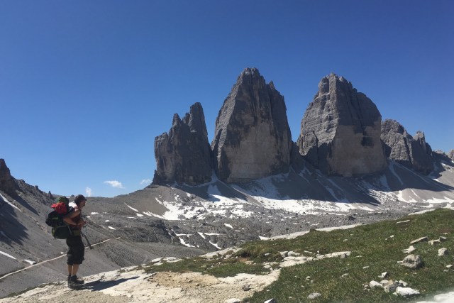 Überall wimmelt es von Leuten, die für Fotos posieren und sich laut unterhalten oder herumschreien. Nicht meine Art, die Berge zu genießen, daher setze ich meinen Weg fort (das obligatorische Bild mit mir vor den Drei Zinnen darf natürlich trotzdem nicht fehlen).