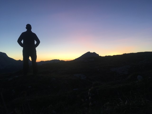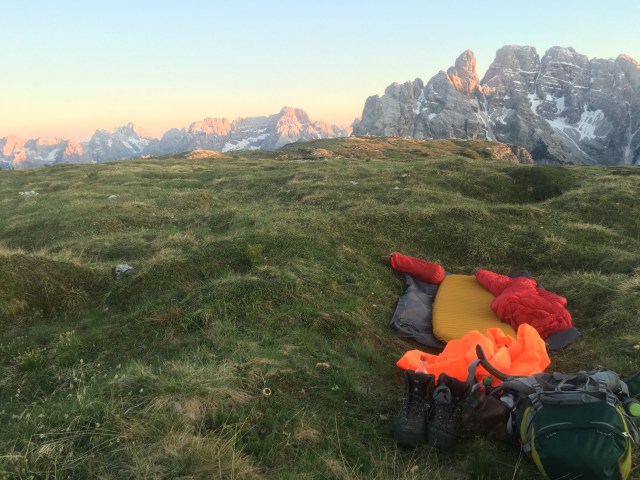 Ich richte meinen Schlafplatz im Freien ein und habe von hier aus eine gute Sicht auf die Drei Zinnen sowie etliche andere Bergmassive. Ich genieße den Sonnenuntergang und verkrieche mich danach in meinen gemütlichen Schlafsack.