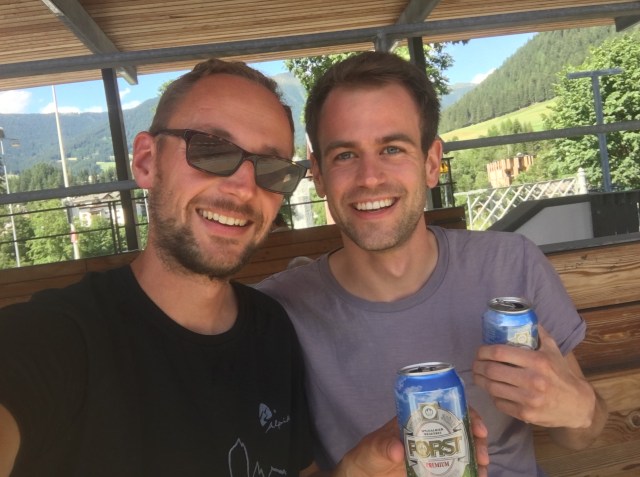 Kurz nach 16 Uhr rollt dann der Zug in Welsberg ein und ich nehme Martin freudig in Empfang. Gemeinsam trinken wir ein Willkommens-Bier, bevor uns der Bus zu unserer Pension kutschiert.