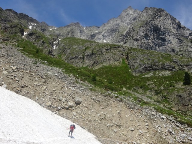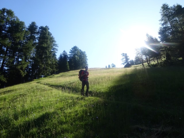 Da wir gestern noch nicht den Abstieg nach Antholz absolviert haben, stehen uns heute 1,5 Etappen bevor, gespickt mit unglaublich vielen Höhenmetern. Zunächst steigen wir über 1100m hinab, um nach einer kurzen Essenspause ganze 1540m hinauf zu steigen. Der Anstieg bringt uns noch mal an unsere Grenzen und die Strecke zieht sich ganz schön. Immer wenn wir denken, jetzt müsste bald die Hütte erscheinen, biegen wir um die nächste Ecke und sehen den Weg erneut ansteigen. Das letzte Stück führt der Weg über Holzstege und -treppen und erfordert noch mal unsere ganze Konzentration und Kraft.