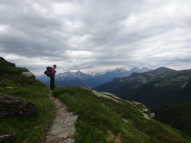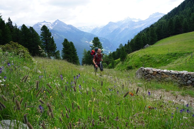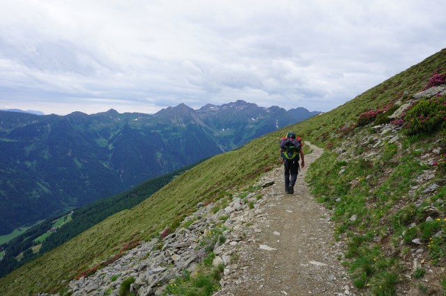 Heute ist es Martin, der voraus rennt und den Aufstieg motiviert vorantreibt. Ich freue mich über seinen Ehrgeiz und darüber, dass er so schnell in unsere Tour reingefunden hat. In nicht einmal zwei Stunden sprinten wir ca. 1100 Höhenmeter bergauf bis zur Michlreis-Alm. Bei den Hinweisschildern am Wegesrand verlese ich mich des Öfteren und bekomme zunehmend Hunger auf Milchreis. Leider steht der auf der Alm nicht zur Auswahl und so ziehen wir weiter bergauf Richtung Sonnklar-Alm. Ab hier ist der größte Teil des Aufstiegs geschafft. Was wir bisher an Höhe bewältigt haben, müssen wir nun noch an Laufstrecke aufholen: dem Kellerbauerweg in nordwestlicher folgend geht es ca. 14km bis zur Chemnitzer Hütte. Der Weg liegt konstant auf einer Höhe zwischen 2200-2500m und es sind somit nur vereinzelt Anstiege zu bewältigen, die dafür aber um so knackiger ausfallen.
