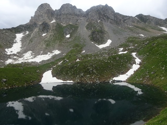 Die Kilometer ziehen sich ewig und jeder weitere Schritt kostet uns mehr Energie. Wir passieren etliche Übergänge wie Gorner Joch, Lappacher Jöchl und Nevesjoch, ehe wir den Tristensee erreichen. Diesen hatten wir zu Beginn als mögliche Biwakstelle anvisiert. Allerdings ist es nun nicht mehr weit bis zur Hütte und das Wetter zeigt keine Besserung, sondern lässt eher erkennen, dass es bald regnet. Daher legen wir eine Rast am idyllischen Bergsee ein, sehen sogar ein paar Fische umherspringen und rüsten uns schließlich für den letzten Kraftakt.