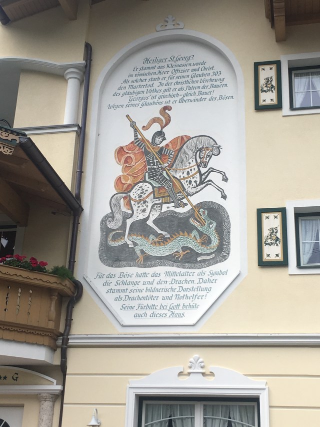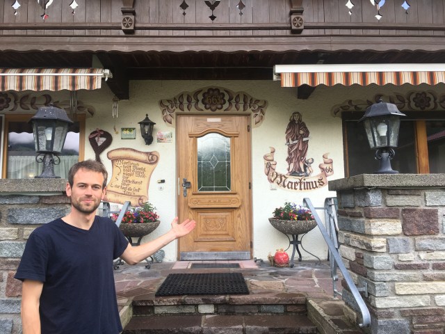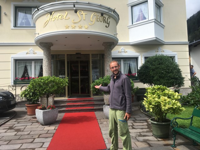 Nach dem Essen warten wir noch einen kurzen Regenschauer ab, bevor wir ca. eine Stunde nach Mayrhofen laufen, der Touristenhochburg schlechthin. Mir war aufgrund meines Besuchs im letzten Jahr schon vorher bewusst, was mich erwartet, noch dazu auf einen Samstag. So müssen Martin und ich uns erst daran gewöhnen, überall von Menschen umgeben zu sein, egal wohin man tritt. Hinzu kommt, dass dieses Wochenende ein Festival mit den „Ursprung Buam“ in der Erlebnissennerei Zillertal stattfindet: „Die Herzblut-Musikanten garantieren ein abwechslungsreiches Musikprogramm, mit zahlreichen Größen der volkstümlichen Musik.“ Dies verspricht zumindest die offizielle Seite. Das entsprechend angetrunkene und gut gelaunte Klientel ist im Ort nicht zu übersehen und zu überhören. Wir durchqueren den Ort und verschaffen uns einen Überblick, schauen mal in dieses und mal in jenes Geschäft. Am Anfang des Ortes liegen übrigens „unsere“ Pensionen St.Georg und Martinus direkt nebeneinander und wir lassen uns es nicht nehmen, dies fotografisch festzuhalten. Nach einem halben Tag Stadttrubel reicht es uns dann auch und wir fahren mit dem Bus zurück nach Finkenberg, wo augenblicklich die Stille und Dorfydille zurückkehrt.