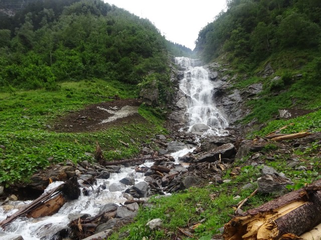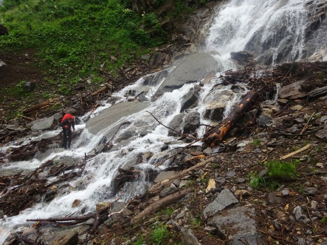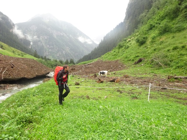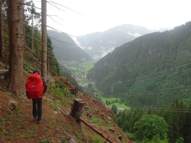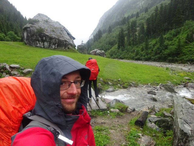 Auf schmalen Pfaden wandern wir also talauswärts, leicht bergab Richtung Ginzling, während es weiter regnet. Uns soll es nicht stören, da wir bisher echt Glück mit dem Wetter hatten. Außerdem kommt somit endlich mal meine Regenhose zum Einsatz – der so ziemlich einzige Gegenstand in meinem Gepäck, den ich bisher noch nicht gebraucht habe und der mir heute gute Dienste leistet.