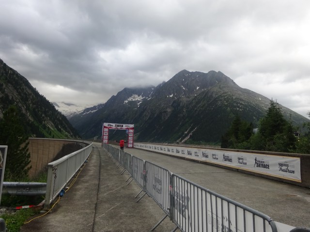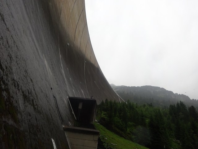… war heute leider nicht im Angebot, dafür jede Menge Regen. Schon als wir am Morgen aufbrechen, werden wir bereits mit leichtem Regen erwartet, der sich im Laufe des Tages eher noch verstärkt. Da die heutige Etappe jedoch als wenig technisch anspruchsvoll beschrieben ist, sollte dies kein Problem darstellen. Vom Schlegeisstausee steigen wir zunächst in Serpentinen hinab und können die gigantische Staumauer von unten betrachten. Direkt an der Staumauer führt sowohl ein Klettersteig als auch eine Kletterroute hinauf. Beides hat mich schon letztes Jahr gereizt, als ich auf dem Berliner Höhenweg unterwegs war. Allerdings war ich bisher nur im Regen hier und da ist mir dieses Unterfangen doch zu riskant. Zudem habe ich auf der aktuellen Route kein Klettersteigset bei mir.