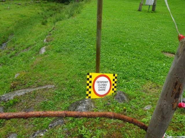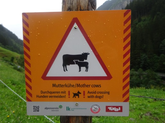 Da sind zum Beispiel die Hinweisschilder, dass der Weg gesperrt ist. Die Alternative wäre jedoch, auf der viel befahrenen Straße zu laufen, daher entscheiden wir uns doch lieber für den Wanderweg. Spätestens, als wir einen reißenden Bach/Fluss queren müssen, ergeben die Warnschilder Sinn. Es findet sich einfach keine schmale Stelle, an der wir den Bach passieren können, ohne nasse Füße zu bekommen. Daher suche ich eine Stelle heraus, die mir am Geeignetsten und Sichersten erscheint. Mit viel Balance und voller Konzentration gelange ich auf die andere Seite und kann nun mitfiebern, wie Martin diese Stelle bewältigt. Nunja, Fotos mache ich als Beweismaterial nebenbei auch noch. Die Stelle ist geschafft, allerdings hat Martin als Opfer nun nasse Turnschuhe und Socken bringen müssen. Kurz darauf müssen wir ein paar Kühe queren, unter denen sich ein Jungtier befindet. Warnschilder bezüglich Mutterkühen haben wir schon zu Genüge gesehen und es erscheint uns sinnvoll, dies ernst zu nehmen. Die Mutterkuh steuert bereits auf uns zu und wir sind bemüht, so schnell wie möglich den nahen Elektrozaun anzusteuern und uns dahinter in Sicherheit zu bringen. Die Kuh lässt schließlich von uns ab und pinkelt erst einmal in aller Ruhe. Soll wohl heißen: mein Revier.