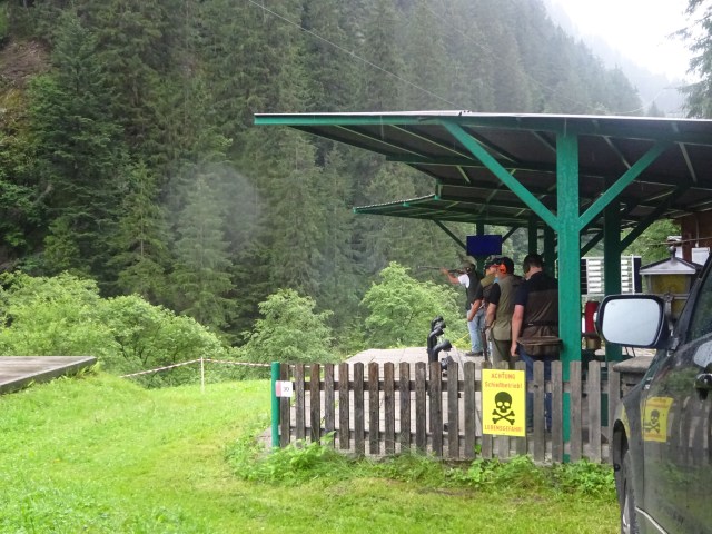 Wir setzen unseren Weg erleichtert fort und es kommt zunächst zu keinen weiteren Zwischenfällen. Nach dem Wirtshaus Karlsteg queren wir die Straße und folgen einem Steig auf der rechten Seite über den Lawinenschutzbau. In der Ferne sind laute Geräusche zu hören, die wir nicht ganz zuordnen können. Wir vermuten, dass es Schüsse sind, es könnte aber auch eine Sprengung, ein Feuerwerk oder sonstiges sein. Ein etwas mulmiges Gefühl haben wir schon, da wir die Geräusche nicht einzuordnen wissen und da sie auch nicht leiser werden. Als wir uns der Quelle des Lärms nähern, bestätigt sich unsere erste Vermutung: es findet ein Tontaubenschießen statt und wir müssten eigentlich genau vor den Schützen unseren Weg fortsetzen. Also entscheiden wir uns, hinter dem dazugehörigen Vereinshaus entlang zu gehen. Dort sitzen einige Schützen bei Bier und Wurst und machen gerade Pause. Kurzentschlossen holen wir uns auch eine Wurst und legen ebenso eine Pause ein. Lustigerweise steht auf der ausgehängten Speisekarte auch „Munition“ und „Grundausrüstung“. Da wir jedoch nicht wissen, was wir damit anfangen sollen, bleibt es bei der Wurst. Die meisten Schützen sind nicht sehr gesprächig und eher grummelig – ein eigenartiges Völkchen. Schließlich finden wir doch noch jemanden, der mit uns spricht. So erfahren wir, dass die nächsten zwei Tage die österreichische Meisterschaft im Tontaubenschießen stattfindet. Heute gibt es ein letztes Training. Lustig, was es alles gibt! Wir schauen noch eine Weile zu, wie die gelben Scheiben in der Luft zerspringen und ziehen schließlich von dannen.