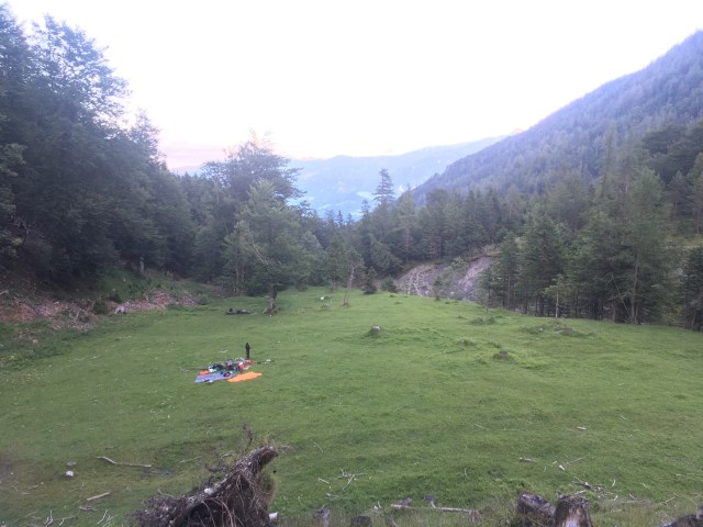 Somit wird uns klar, dass dies heute nicht unser Schlafplatz werden wird und wir weitersuchen müssen. Heißt konkret, dass wir nach Verabschiedung des „Hüttenchefs“ noch über eine Stunde aufsteigen, bevor wir etwas passendes finden. Wir haben es bis kurz vor die Stallenalm geschafft und somit schon einen Großteil der eigentlich für morgen geplanten Etappe hinter uns.