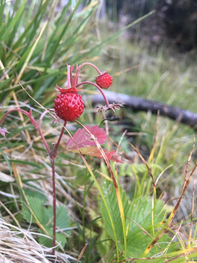 Wir lassen uns schließlich auf einer Weidefläche nieder und sind vom Wanderweg aus nur teilweise sichtbar. Wasser haben wir in weiser Voraussicht in Schwaz nachgefüllt. Es gibt zwar direkt neben uns ein Flussbett, dies ist aber leider schon ausgetrocknet. Beim Erkunden der Gegend entdecke ich jede Menge Walderdbeeren, die ich sogleich pflücke – ein willkommener Nachtisch und eine schöne Abwechslung zur Tütensuppe 😋.