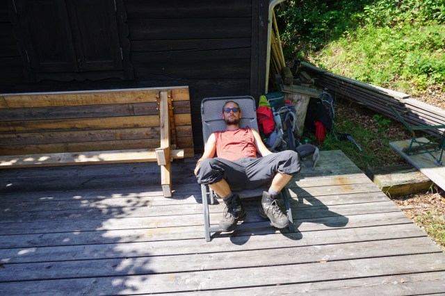 Als der Lärm gänzlich verschwunden ist, machen wir eine Rast und schauen uns derweil nach einer Schlafstätte um. Ich entdecke am Waldesrand eine kleine Jagdhütte und schaue mir dies genauer an. Sie ist zwar verschlossen, hat jedoch eine schöne große Terrasse mit Blick auf die Berge. Es scheint, als sei lange keiner mehr hier gewesen, es sieht alles sehr verlassen aus. Daher setzen wir uns zunächst auf die Terrasse und freuen uns, etwas gefunden zu haben.