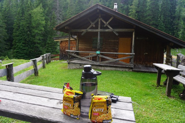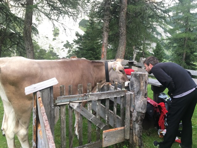 Am Seebensee endet unsere heutige Wanderung, den Aufstieg zur Coburger Hütte heben wir uns für morgen auf. Wir brauchen eine Weile, bevor wir einen geeigneten Biwakplatz finden und entscheiden uns schließlich für eine Jagdhütte, die von einem Holzzaun umgeben ist. Der Zaun ist später noch unser Glück, da uns schon bald zahlreiche Kühe besuchen und versuchen, auf die andere Seite des Zauns zu kommen. Die Belagerung hört irgendwann auf, das Glockengeläut begleitet uns jedoch noch die ganze Nacht hindurch.