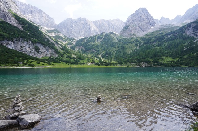 Hinab geht es zur Hochfeldenalm, wo wir eine Essens-und Trinkpause einlegen. Wir haben Beide richtig Hunger auf Kaiserschmarrn und bekommen jeder eine ordentliche Portion davon. So können wir voller Energie unseren Weg zur Seebenalm und zum Seebensee fortsetzen. Auf den gut ausgebauten und viel begangenen Wegen fallen uns erneut die vielen E-Biker auf, die sich in letzter Zeit echt vermehrt haben.