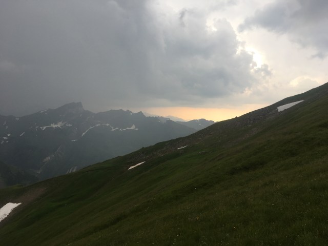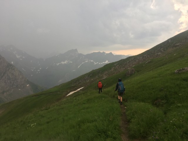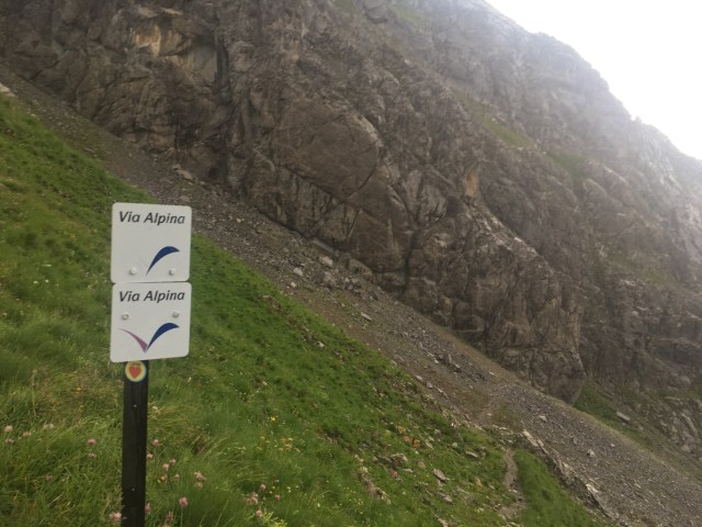 So lässt es sich gut aushalten und wir genießen die regnerische Aussicht aus dem Trockenen heraus. Kurze Zeit später gesellt sich noch Miri zu uns, die dem Regen ebenfalls entfliehen wollte. Wir unterhalten uns über unsere Touren und als der Regen aufhört, ziehen wir zu dritt weiter. Wir treffen nach ein paar Minuten auf eine Wegkreuzung, wo wir auf den violetten Weg der Via Alpina treffen, der von nun an dem roten Weg bis Oberstdorf gleicht.