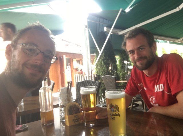 In Oberstdorf gönnen wir uns in einem der zahlreichen Restaurants ein Ziel-Bier/Radler und und eine Pizza. Es ist geschafft, die Alpen sind überquert! Insgesamt war ich nun 54 Tage unterwegs, etwa 7,5 Wochen, davon hat mich Martin ab Tag 31 für ca. 3 Wochen begleitet. Ich habe ca. 830 Kilometer zurückgelegt, es ging ca. 44.000 Höhenmeter nach oben und ca. 43.000 Höhenmeter bergab. Meinen anfänglichen Sorgen, ob ich diese Route überhaupt schaffe, habe ich mich erfolgreich entgegengestellt. Die ersten Wochen alleine, später dann gemeinsam mit Martin. Keines der Hindernisse konnte uns aufhalten: Blasen an den Zehen oder sonstige Fußbeschwerden, Regen, Gewitter, Sonne, Magen-,Rücken- oder Knieprobleme, Insektenstiche und auch keine auf dem Weg stehenden Kühe. Kein noch so steiler Berg war vor uns sicher und auch meine vorher größte Sorge, die Querung zahlreicher Schneefelder aufgrund des diesjährigen vielen Restschnees war im Endeffekt kein allzu großes Problem. Ich habe etliche Alpenregionen durchquert, angefangen bei den Julischen Alpen in Slowenien, den Karawanken, den Karnischen Alpen und den Dolomiten. Ab dem Pustertal ging es mit Martin noch ein paar Tage weiter durch Südtirol, anschließend durch die Zillertaler und Tuxer Alpen, das Karwendelgebirge, das Wettersteingebirge und letztlich durch das Lechtal wechselnd in die Voralpen, das Allgäu. Und nun stehen wir hier in Oberstdorf, am Ende angelangt.