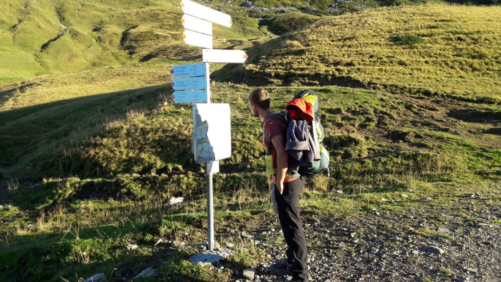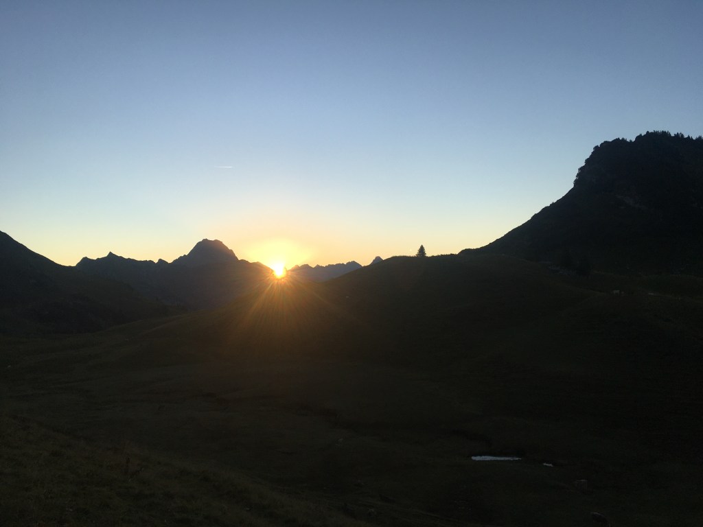 Ab heute laufen wir nun endgültig wieder auf der Via Alpina! Ich stehe bereits kurz nach 6Uhr auf und schaue begeistert, wie die Sonne sich langsam aber sicher über die Berge kämpft. Es gibt kaum Wolken und einem sonnigen Tag steht nichts im Weg. Mein Vater kommt gerade noch rechtzeitig zum Sonnenaufgang hinaus und gemeinsam genießen wir die ersten Sonnenstrahlen des Tages auf unserer Haut.
