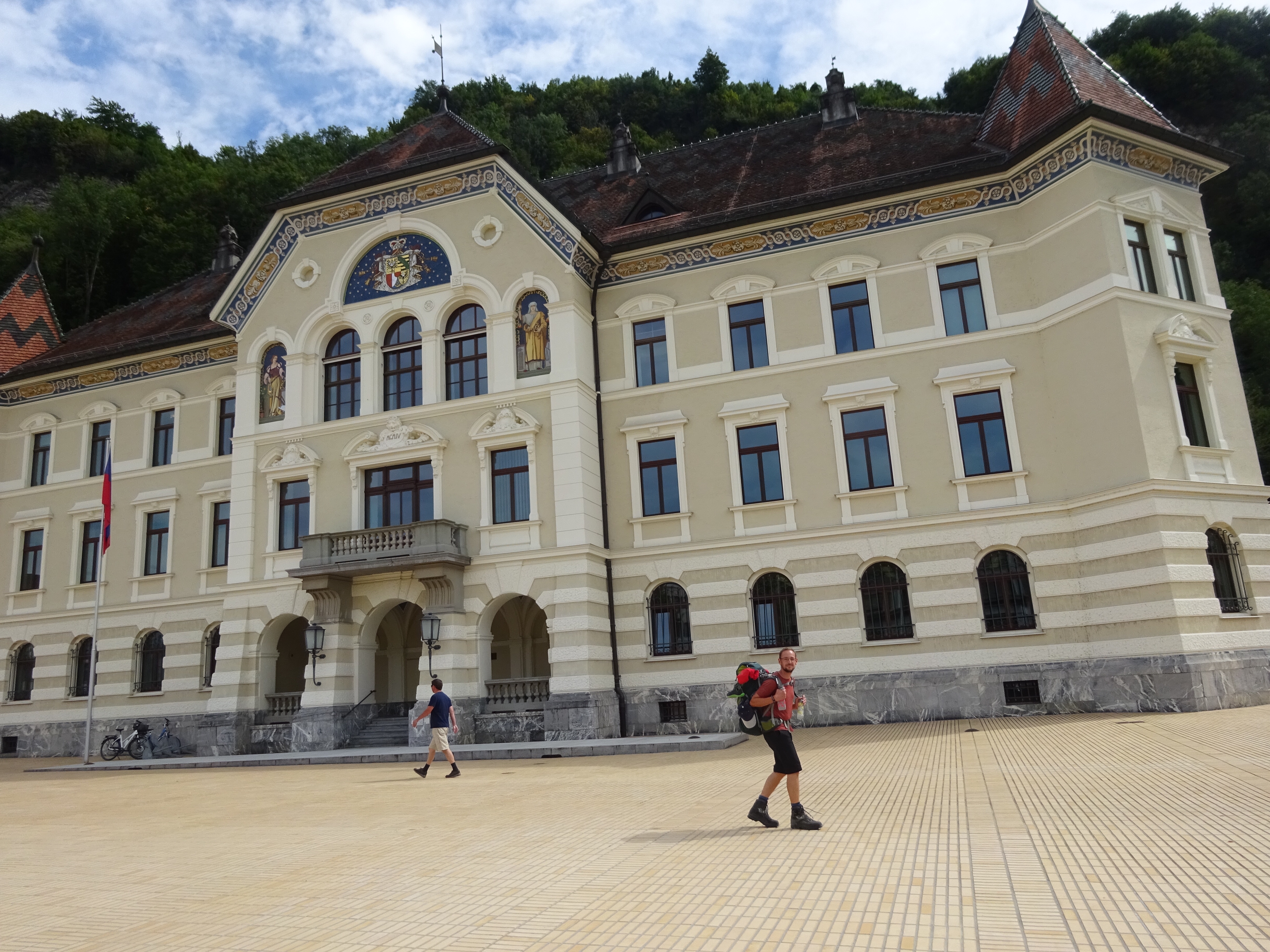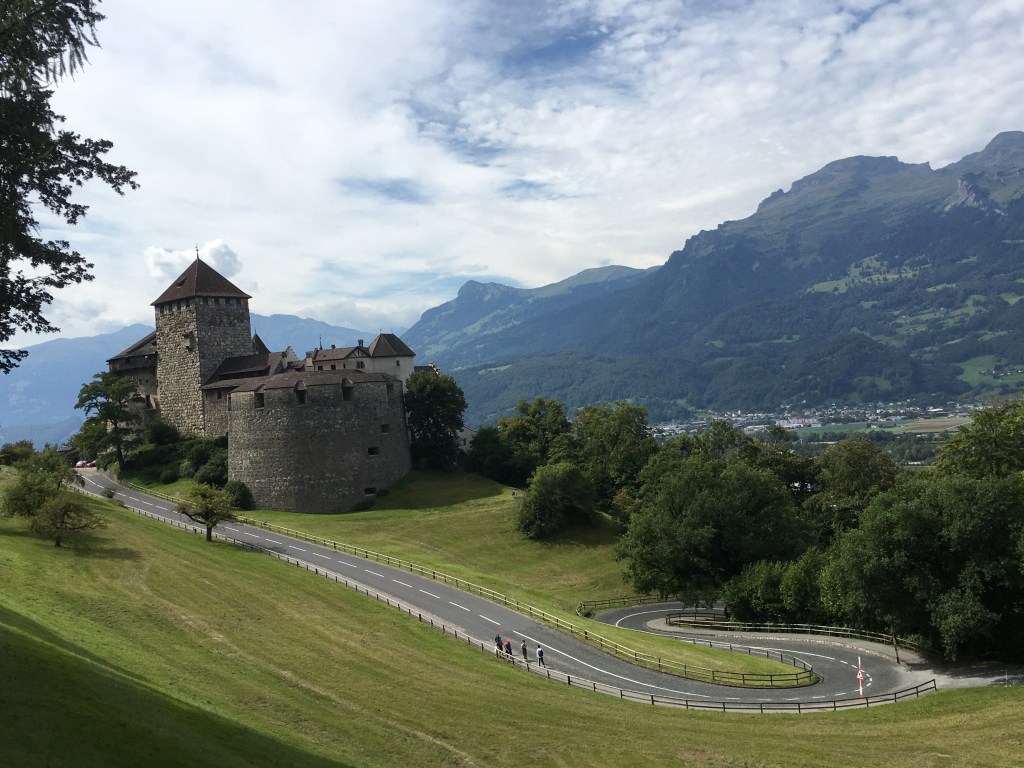 Unsere Etappe besteht somit heute „lediglich“ aus einem 1000m-Abstieg nach Vaduz und 13km Strecke. Unterwegs grüßt man sich inzwischen nicht mehr mit „Servus“, sondern mit „hoi“, was soviel wie „hallo“ oder „schön, dich zu sehen“ heißt. In Vaduz kommen wir direkt am Schloss an, welches seit 1938 Sitz der fürstlichen Familie ist und daher leider nicht besichtigt werden kann. Aktuelles Staatsoberhaupt von Liechtenstein ist übrigens Fürst Hans-Adam II., der die Regierungsgeschäfte im Jahr 2004 jedoch an Erbprinz Alois abgegeben hat. Aber auch von außen ist es schön anzusehen und thront über der Stadt Vaduz, dem Hauptort von Liechtenstein.