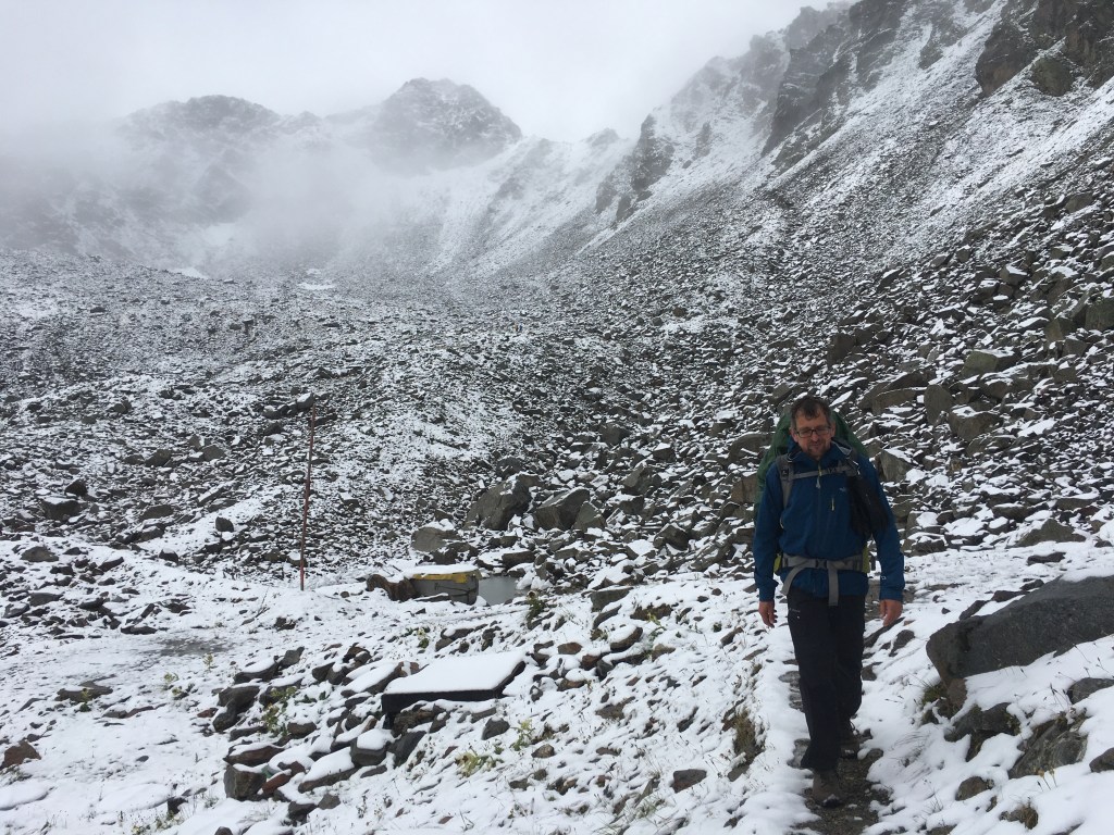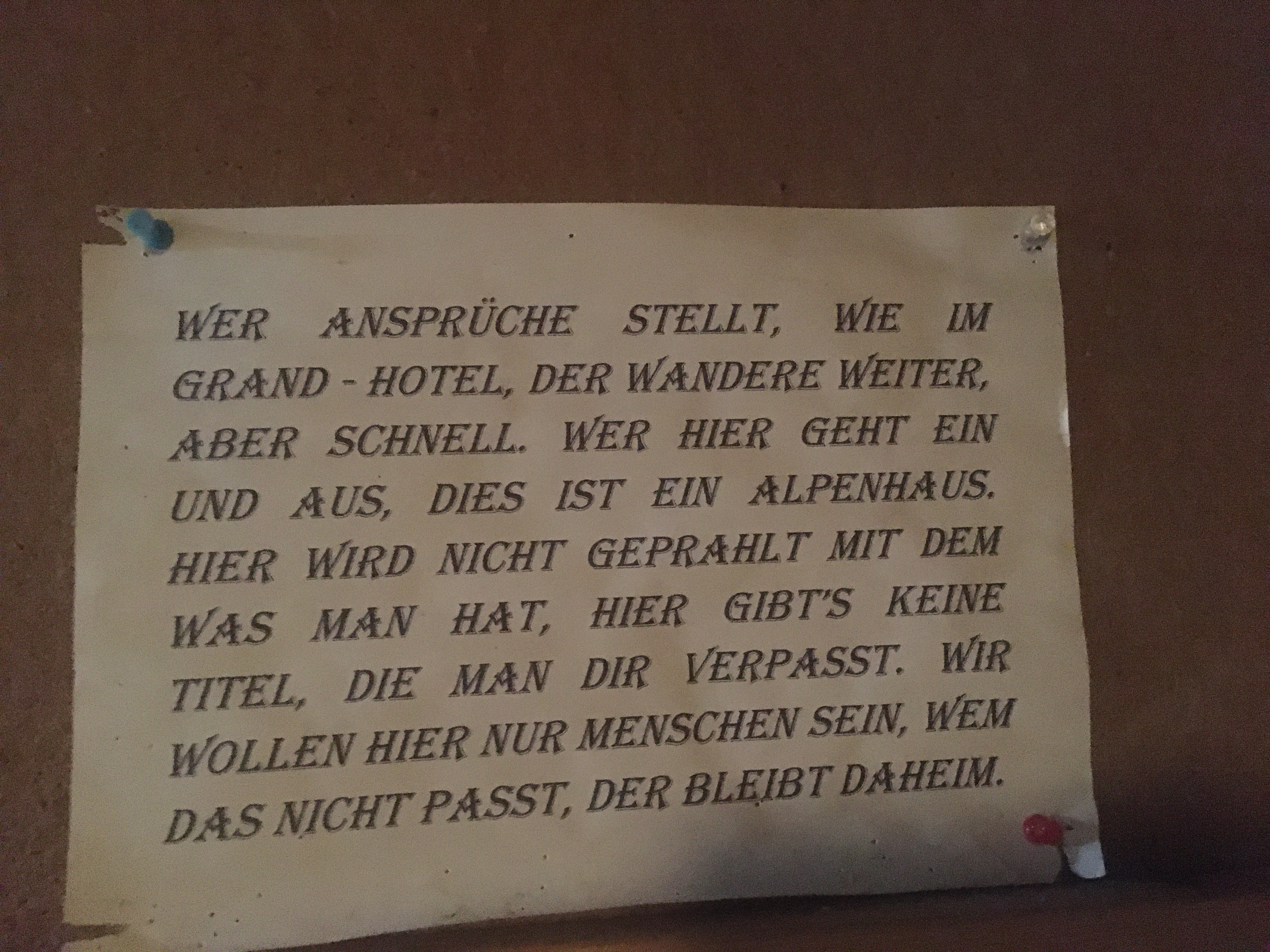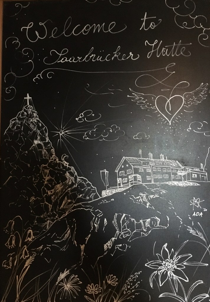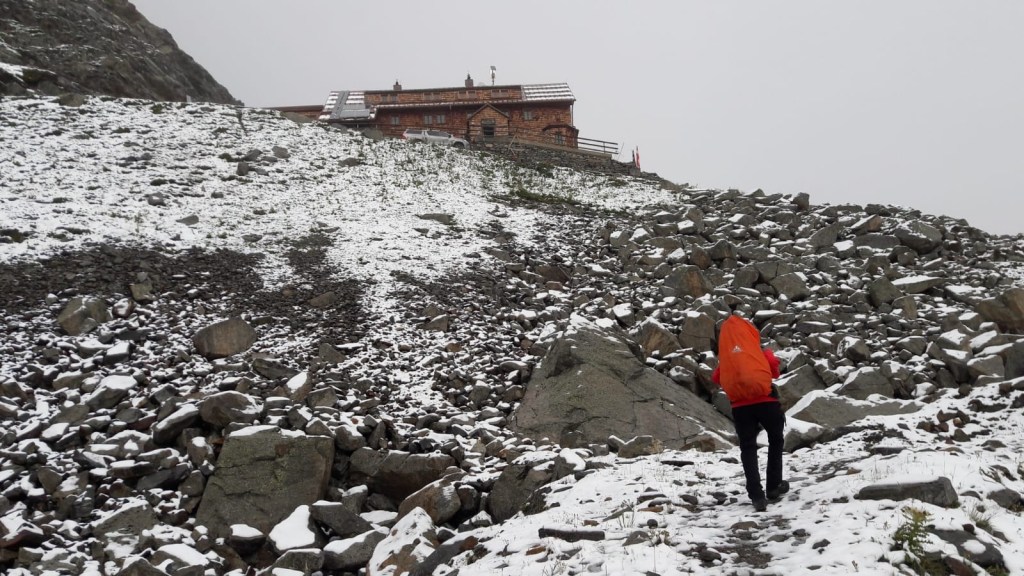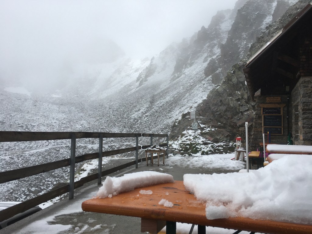 Rund um die Saarbrücker Hütte auf 2538m liegt Schnee und es ist sehr kühl. Trotzdem sind wir froh, dass wir unser Tagesziel – wenn auch auf Umwegen – erreicht haben. Und das heutige Abendessen entschädigt hoffentlich für das schlechte Wetter.