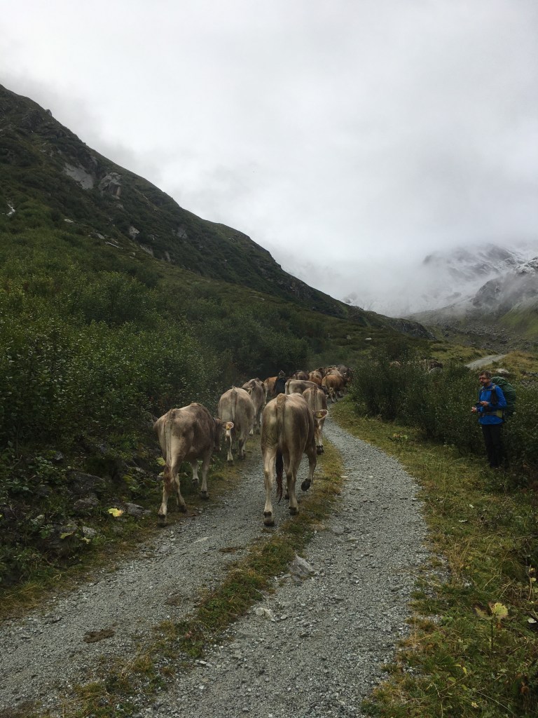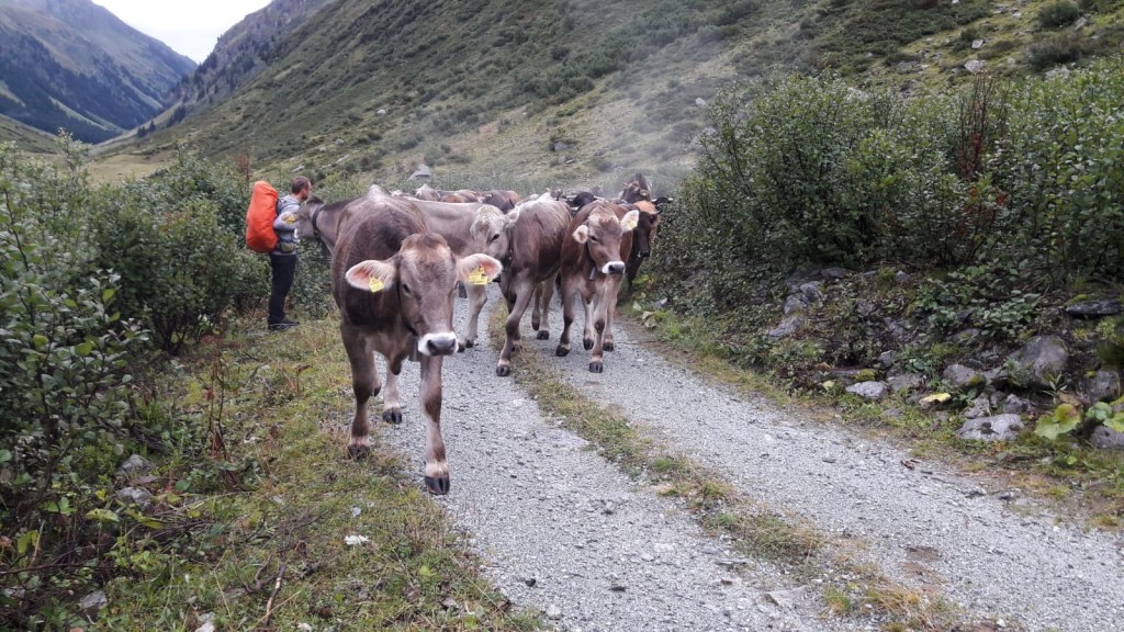 Daher entscheiden wir uns für die längere aber sicherere Variante und steigen durch das Garneratal über 1200 Meter ab zum Ort Gaschurn. Auf dem Abstieg kommt uns eine Herde Kühe entgegen, die von den Hirten hinaufgetrieben wird. Da der Weg auf beiden Seiten begrenzt ist und ich mir nicht sicher bin, ob die Kühe ausweichen, weiche ich stattdessen lieber aus und stelle mich an den Rand. Die ein oder andere Kuh ist dann aber doch recht neugierig und beginnt, mich zu beschnuppern und abzulecken.