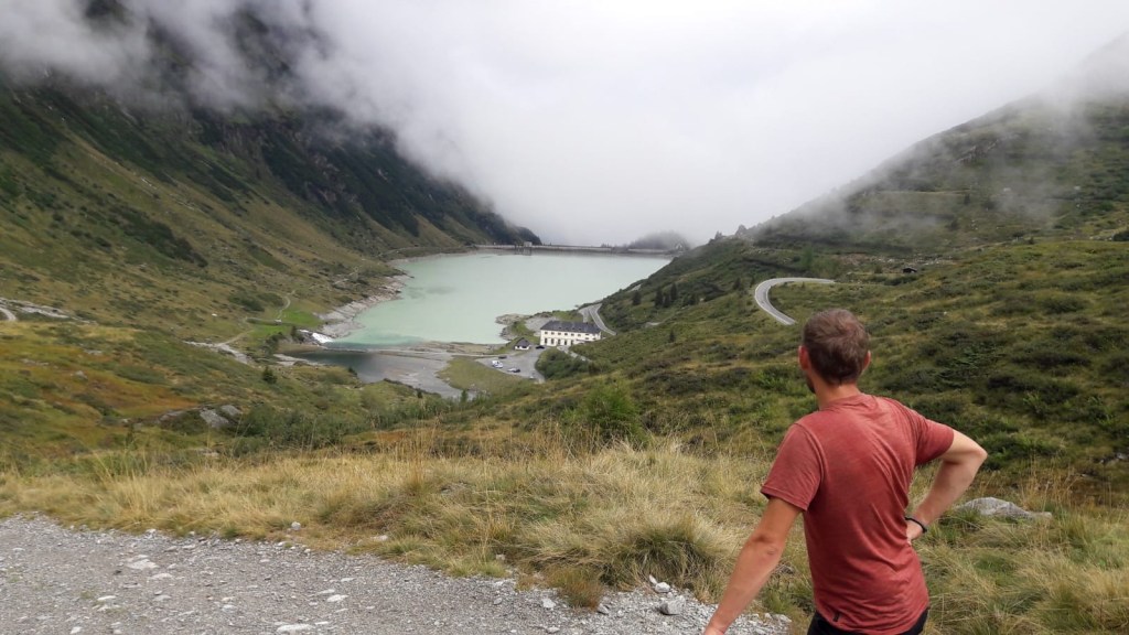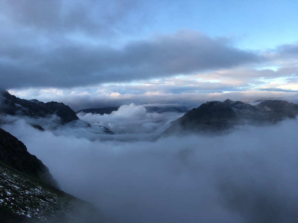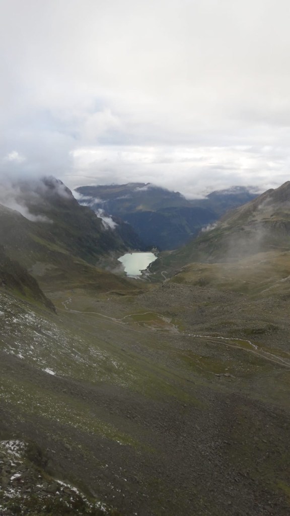 Das Wetter bringt leider auch im Verlauf des Abstiegs keine Besserung und es regnet mal mehr und mal weniger stark. In Gaschurn geht es mit dem Wanderbus wieder hinauf zum Vermunt-Stausee, von wo aus wir unsere Wanderung fortsetzen können. Kurzzeitig klart es ein wenig auf und wir haben sogar kurz das Gefühl, dass der Himmel aufbricht und die Sonne durchkommt. Diese Illusion wird uns aber schnell genommen, als wir mit unserem Aufstieg zur Hütte beginnen. Wir verschwinden wieder zunehmend im Nebel und die Sicht ist meist nur auf ein paar Meter begrenzt. Den Aufstieg von 760 Metern absolvieren wir daher auch recht schnell und sportlich und überholen unterwegs mehrere Menschen.
