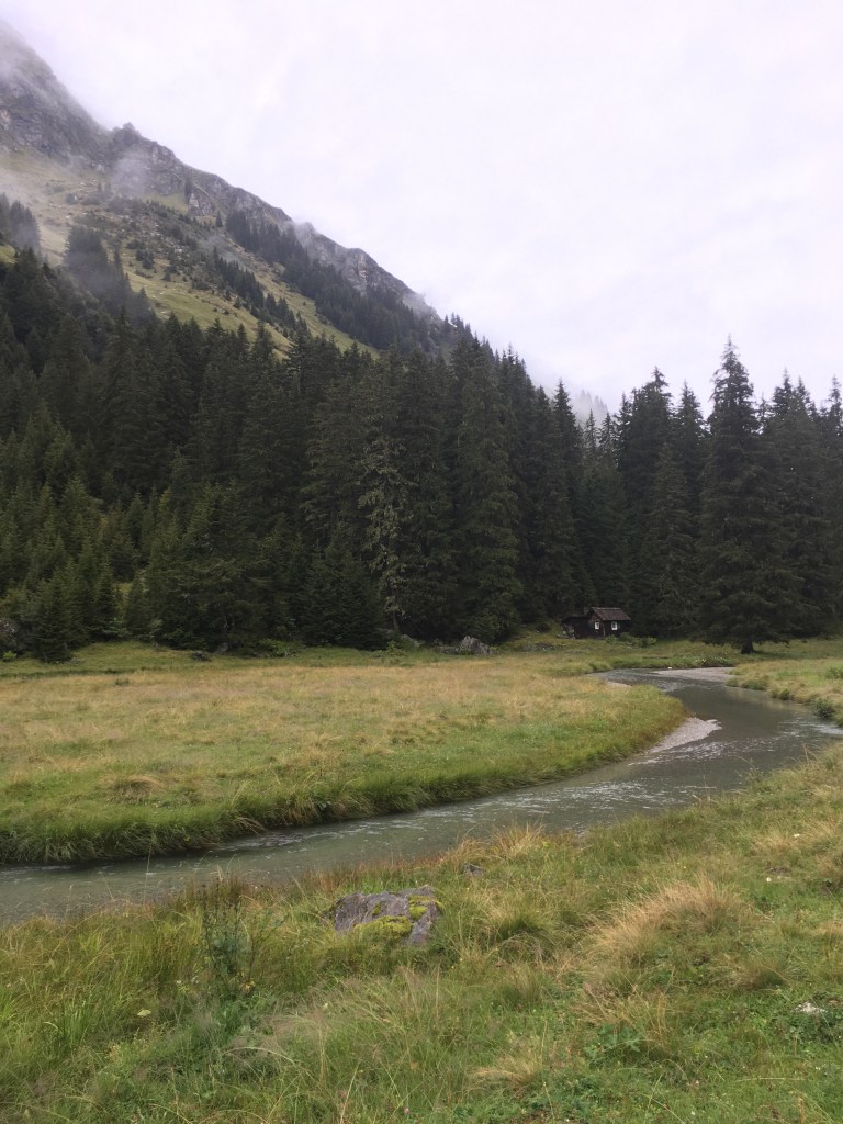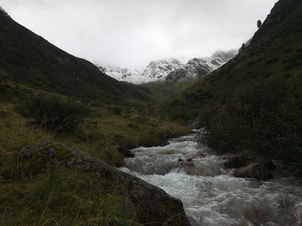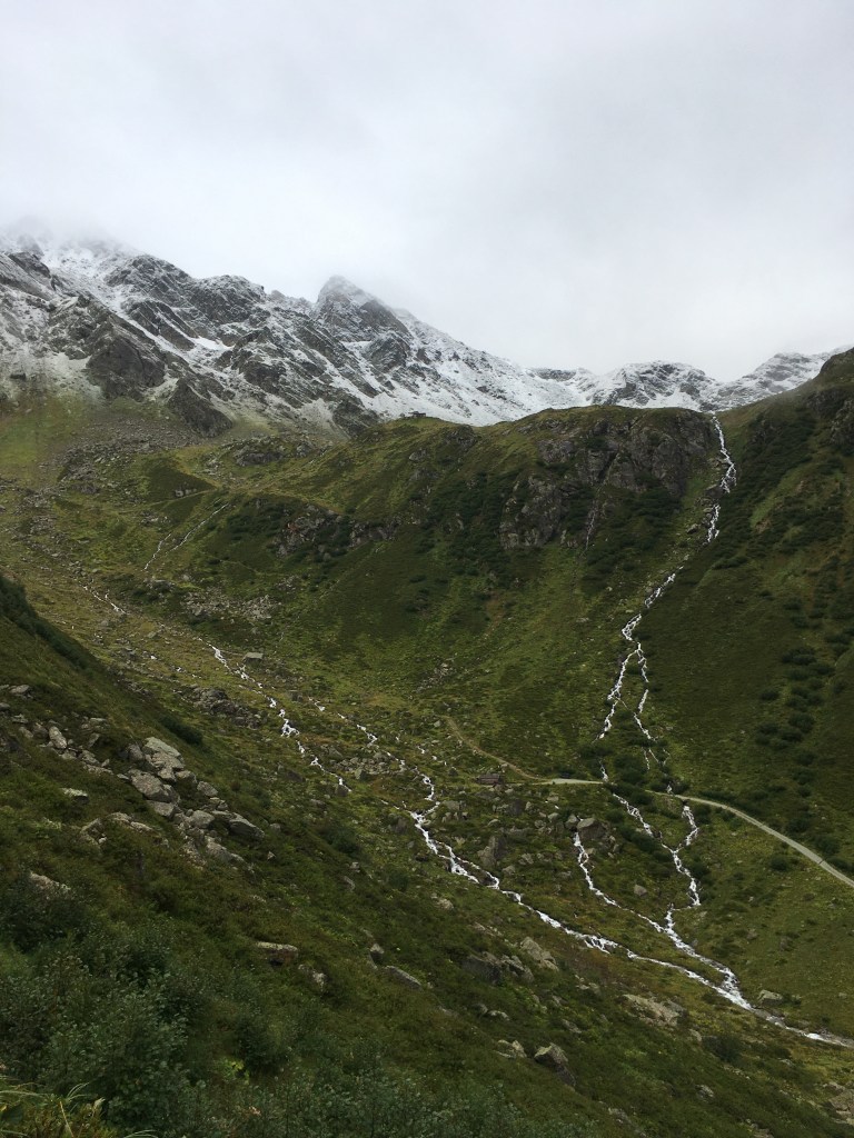 Die Bäche sind in den letzten Tagen zu Flüssen angeschwollen und haben allerhand zu tun, die ganzen Wassermassen aus dem Gebirge ins Tal zu befördern. Auch wir befördern uns heute leider wieder ins Tal und müssen erneut von unserer Route abweichen. Eigentlich war der Plan, heute zum Hochmadererjoch aufzusteigen, was sich auf knapp 2500m befindet. Jedoch liegt bereits kurz über der Tübinger Hütte Schnee und die Sichtverhältnisse sind heute sehr bescheiden.