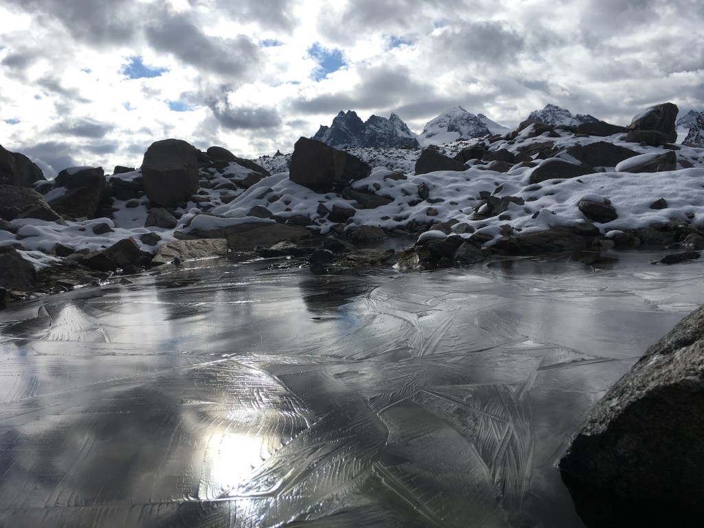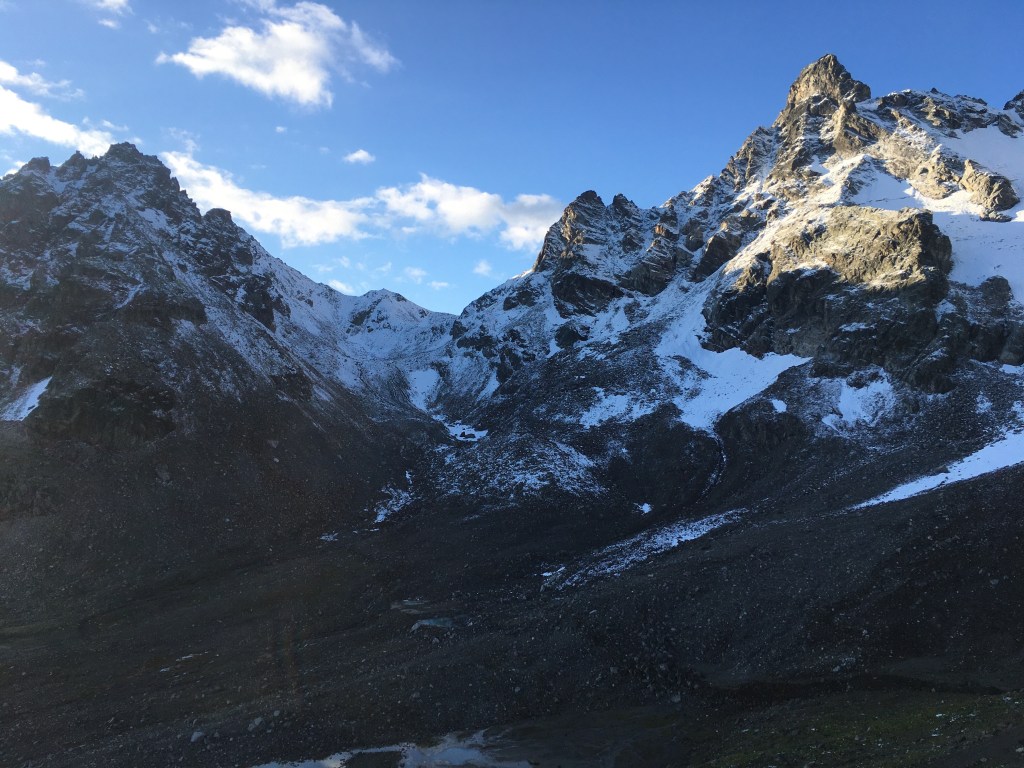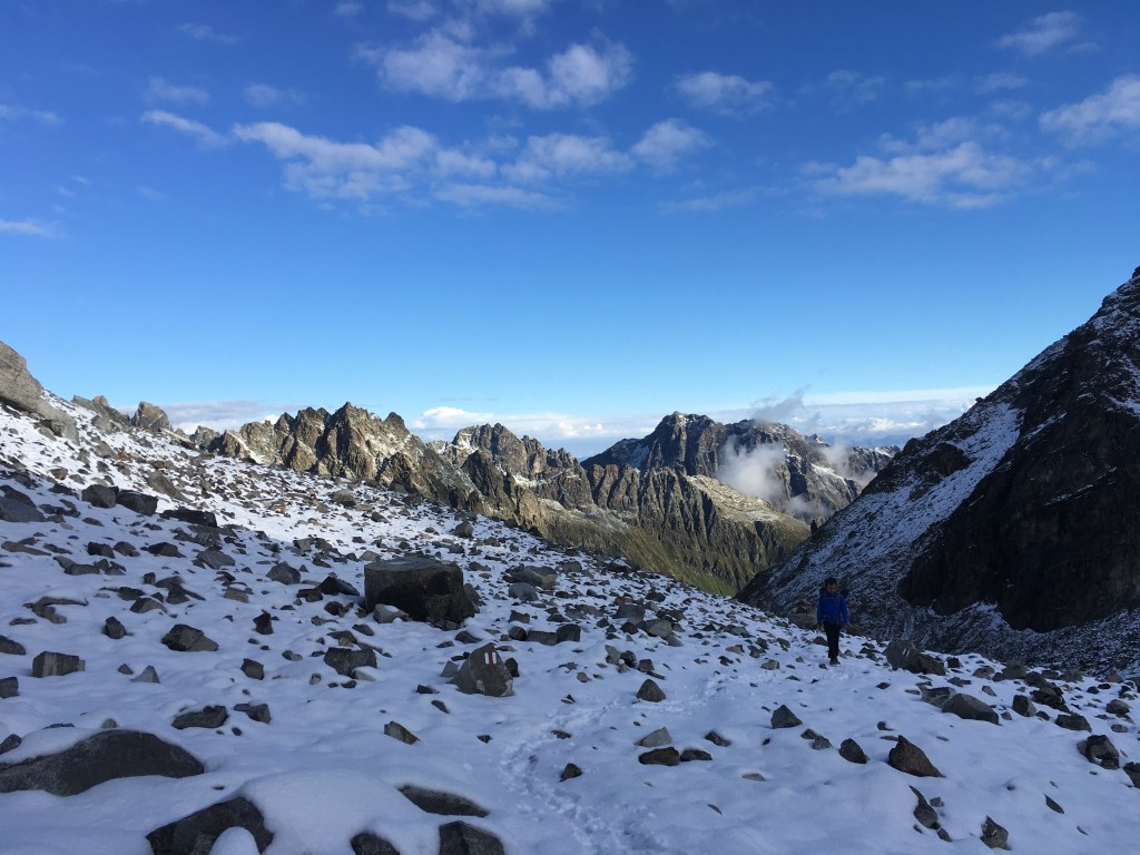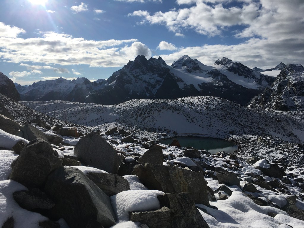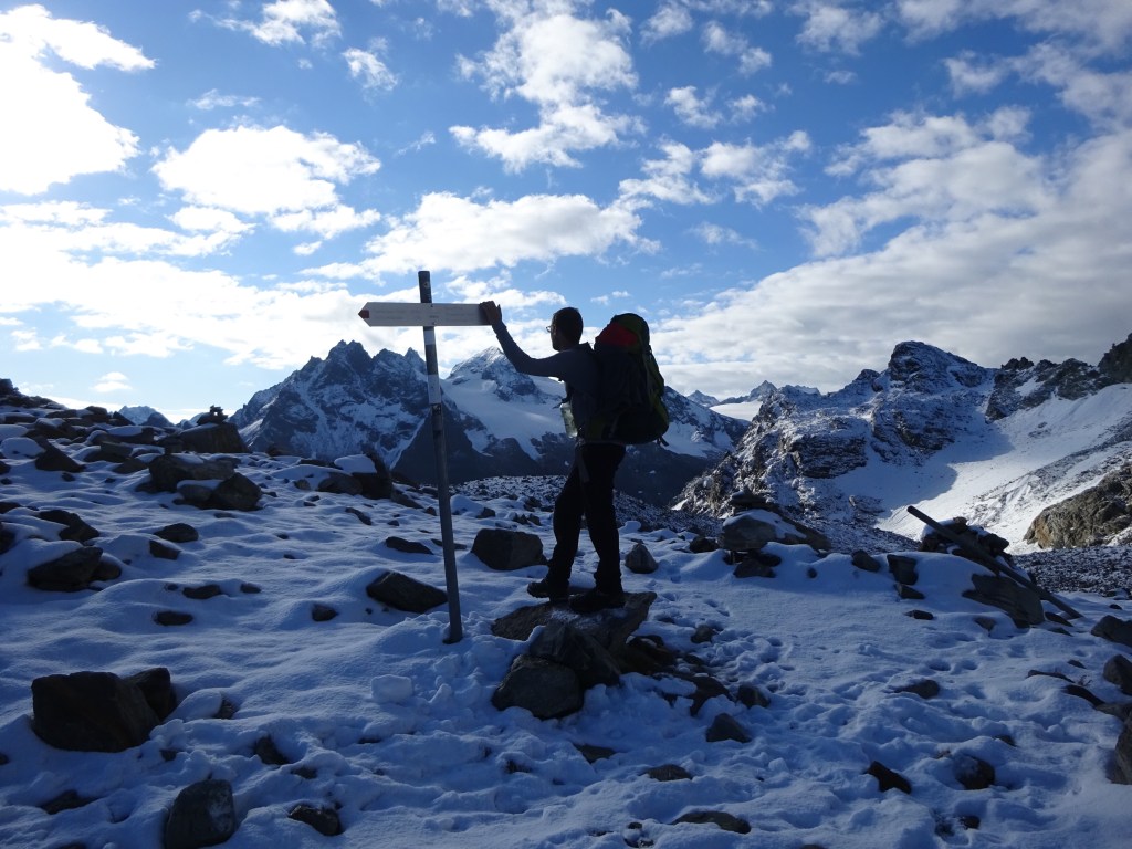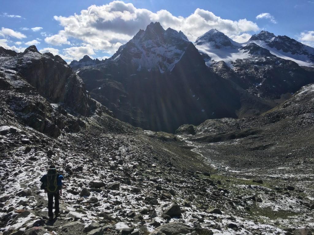 Da das Wetter heute recht stabil aussieht, können wir heute endlich an unserer geplanten Etappe festhalten – ganz ohne Umwege und Bus. Dafür steigen wir 200 Meter hinauf zum Litzner Sattel (2740m). Der Aufstieg erfolgt zunächst im Schatten und je höher wir kommen, desto mehr Schnee liegt auf unserem Weg. Kurz vor dem Sattel erblicken wir schließlich die Sonne. Wir legen eine Frühstückspause ein und lassen uns von der Sonne wärmen. Es tut gut, endlich wieder einen sonnigen Tag zu haben und wir sind dadurch bester Stimmung.