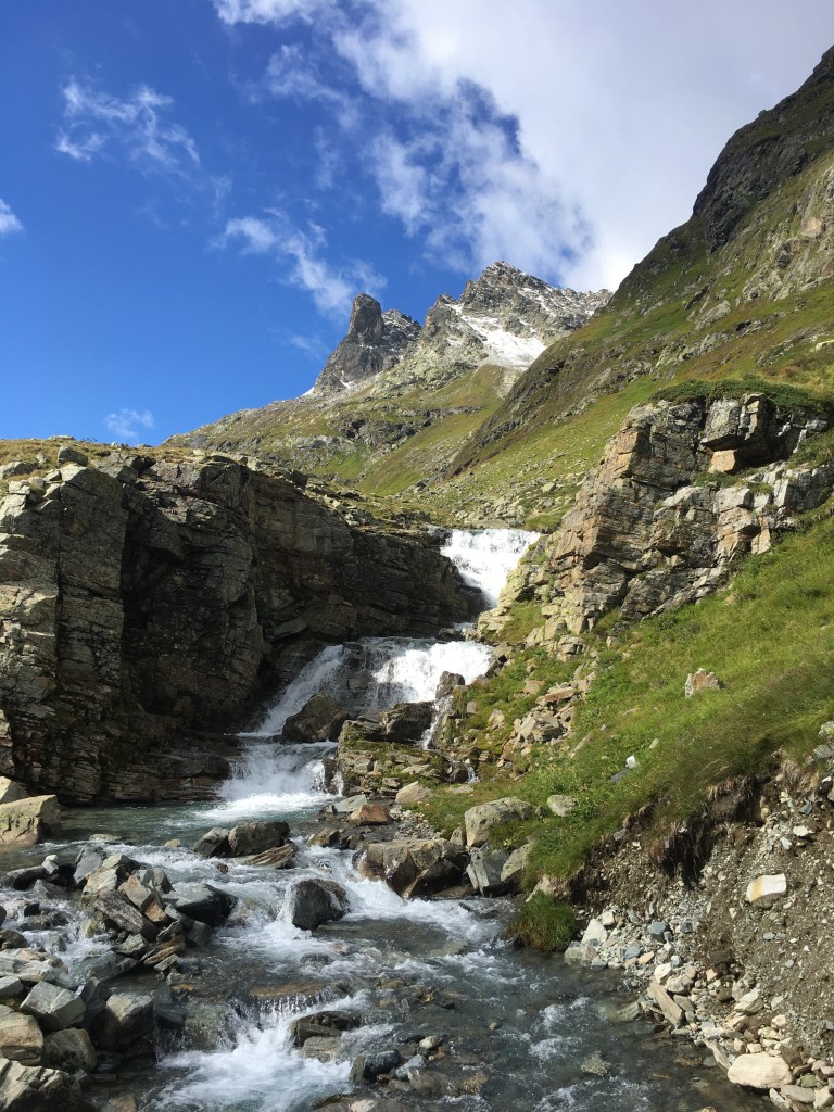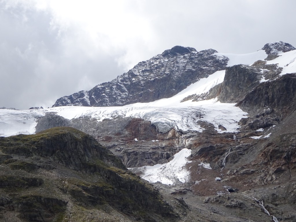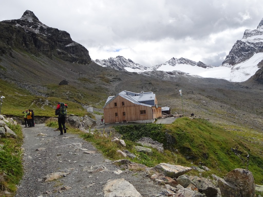 Am Stausee wimmelt es erwartungsgemäß von Tagestouristen, die mit dem Bus hochgefahren wurden und nun eine Runde um den See drehen. Nach einer ausgiebigen Sonnen-Pause geht es für uns hinein ins Ochsental und stetig bergauf bis zur Wiesbadener Hütte, unserem Etappenziel. Während des Aufstiegs haben wir bereits den Vermuntgletscher vor Augen, der jedoch schon erschreckend zurückgegangen ist. An der Wiesbadener Hütte (2443m) ist heute deutlich mehr los und es gibt etliche Wanderer, die vom See hinaufgestiegen sind und sich ein Bier oder etwas zu Essen gönnen.