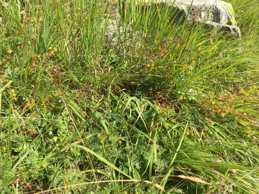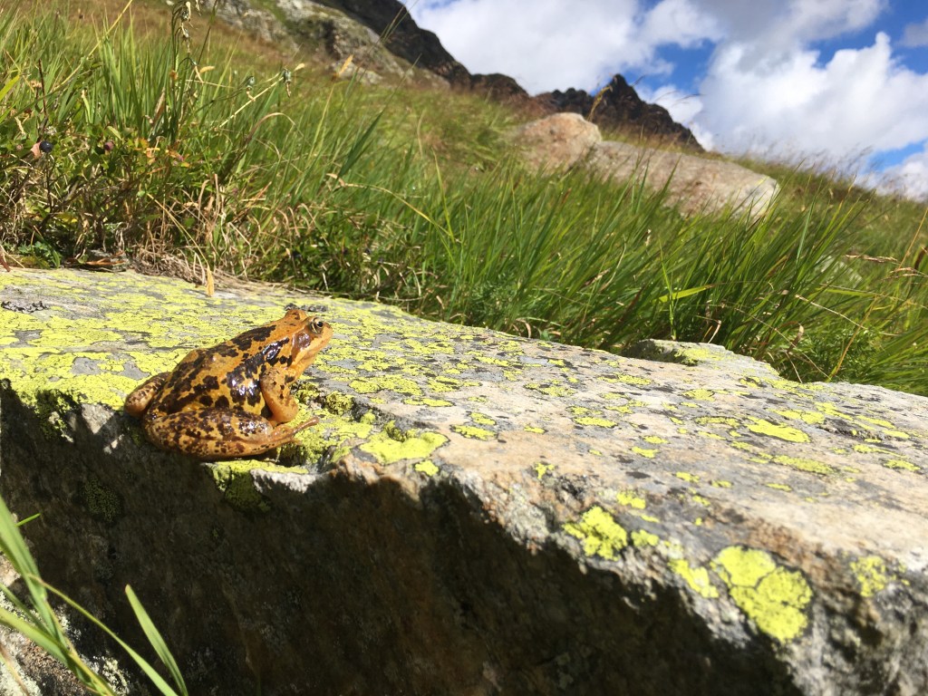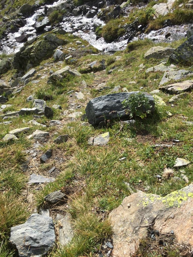 Vom Litzner Sattel genießen wir den Blick auf die Berge und können uns gar nicht daran satt sehen. Da es irgendwann aber doch kalt wird, beginnen wir mit dem Abstieg auf der anderen Seite des Sattels. Unser Weg führt uns über ein riesiges Feld aus Gesteinsbrocken und wir bewegen uns nun eher hüpfend von Stein zu Stein fort. Je weiter wir absteigen, desto näher kommen wir dem Klostertaler Bach, dessen Verlauf wir folgen und der schließlich in den Silvretta-Stausee fließt. Auf unserem Wanderpfad bahnt sich immer mal wieder ein Bach seinen Weg und zwischenzeitlich gleicht unsere Umgebung einem Sumpfgebiet, durch das wir langsam hindurchwaten.